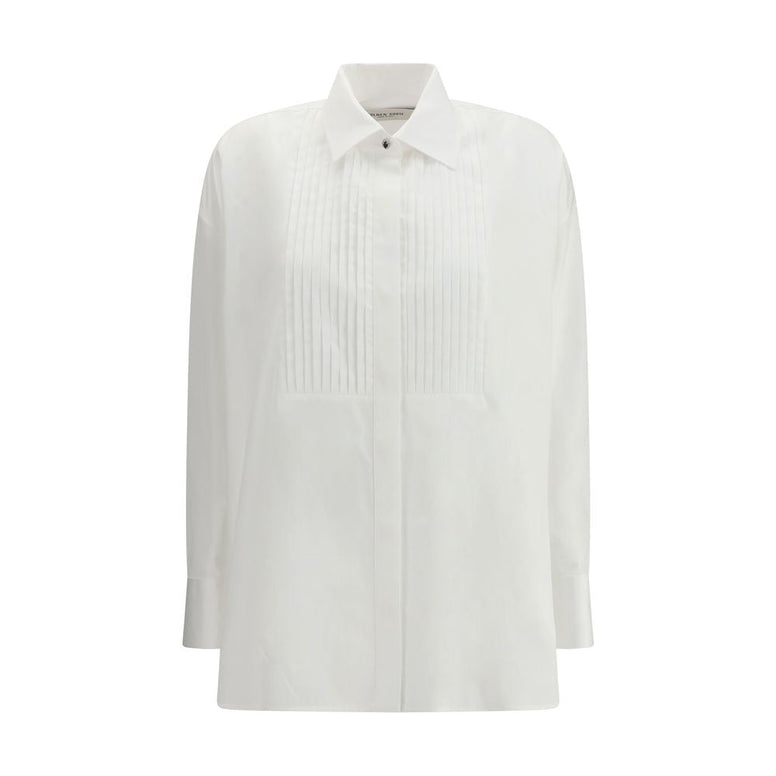 The oversized cotton poplin Shirt by Golden Goose elevates a wardrobe essential with luminous refinement. Its generous, structured silhouette is defined by a back yoke, a concealed placket with mother-of-pearl buttons, and the signature jewel button at the collar. A pleated front bib adds tailored sophistication, while jewel-embellished cuffs bring a touch of shine. The iconic double star at the back completes the shirt with Golden Goose’s unmistakable identity.