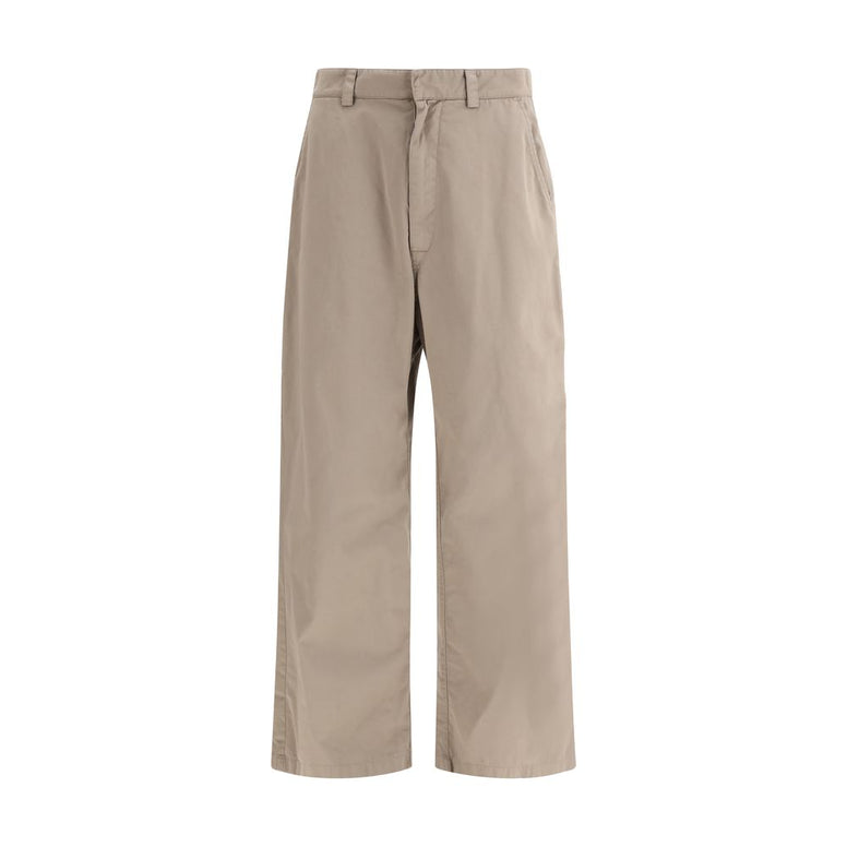 Die Workwear-Hose von Balenciaga interpretiert funktionale Arbeitskleidung neu und setzt dabei auf die zeitgenössische Designsprache des Hauses. Gefertigt aus strapazierfähigem Baumwolltwill, besticht sie durch eine klare, strukturierte Silhouette, die Funktionalität und modernen Stil vereint. Ein verdeckter Reißverschluss und sieben Gürtelschlaufen unterstreichen die praktische Verarbeitung, während die schrägen Vordertaschen und die aufgesetzten Gesäßtaschen an klassische Elemente der Arbeitskleidung erinnern. Abgerundet wird das Design durch eine aufgesetzte Tasche am Oberschenkel mit gesticktem Balenciaga-Logo, die der Hose eine subtile, aber dennoch unverwechselbare Note verleiht.