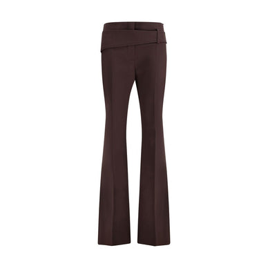 The Slim Trousers with Asymmetric Belt by Sportmax are crafted from a wool blend with a fitted line that naturally follows the silhouette. A slightly low waist and a back ankle zip create a subtle flared effect, while the belt applied on the right hip wraps asymmetrically through the opposite loop for a dynamic detail. Front and back pressed creases enhance the tailored precision of the piece, blending structure and femininity in a refined expression of contemporary elegance.
