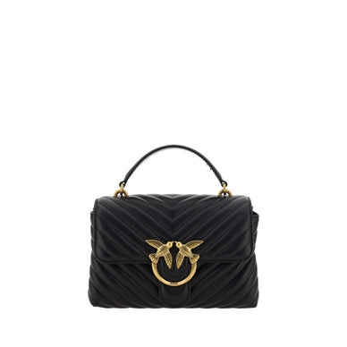 The Calfskin Love Lady Mini Handbag by Pinko, front magnetic flap closure, iconic gold-plated Love Birds logo embossed on the front, quilted and padded design, double interior compartment, removable chain shoulder strap with smooth leather insert, flat rigid top handle, interior flat pocket with zipper, iconic tone-on-tone embroidered brand monogram on the back.